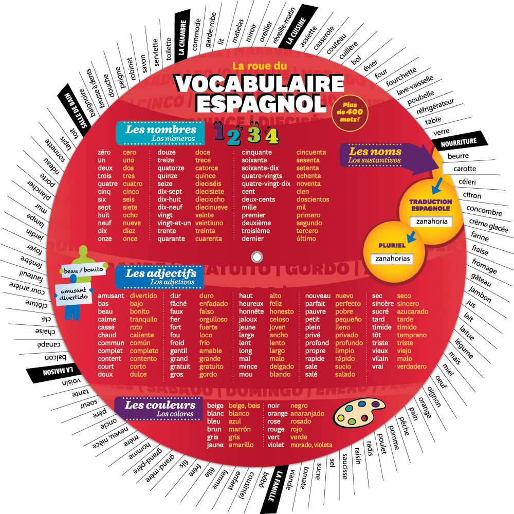 This wheel is a beginner level tool for anyone new to learning Spanish, regardless of age. It contains the basic vocabulary, classified by theme, as well as several useful expressions.
